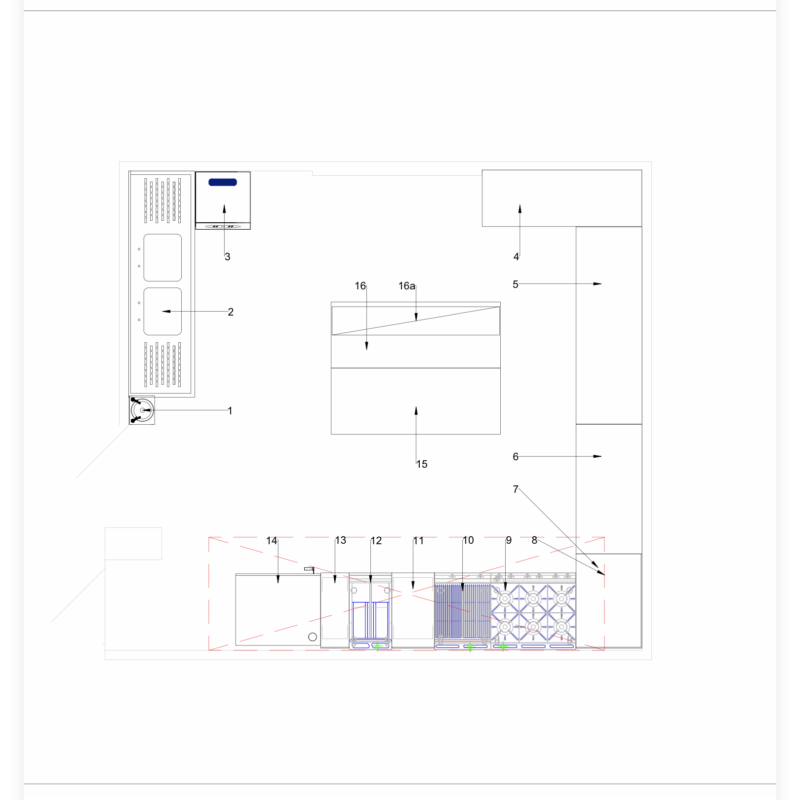 The new kitchen will have 2 under counter fridges (labels 5&6), a cooker, griddle, fryer and pizza oven (labels 9,10,12&14) with the pot wash area being in the corner again (labels 2&3).